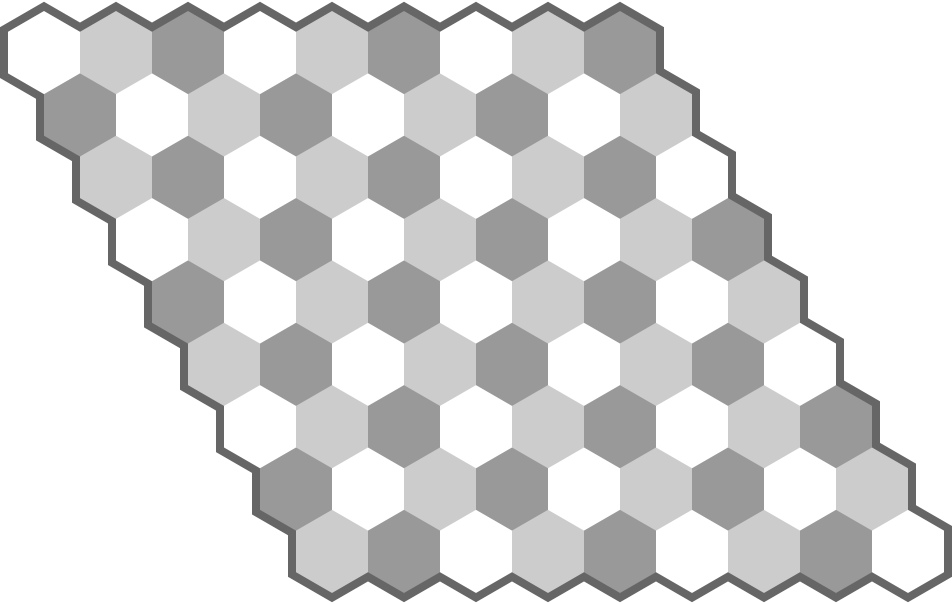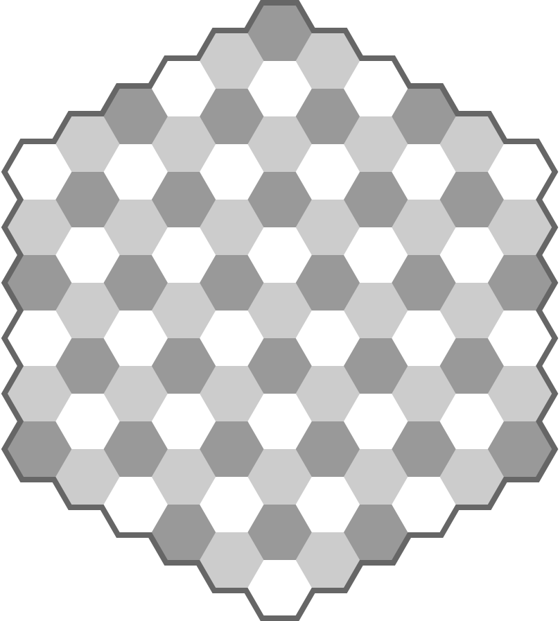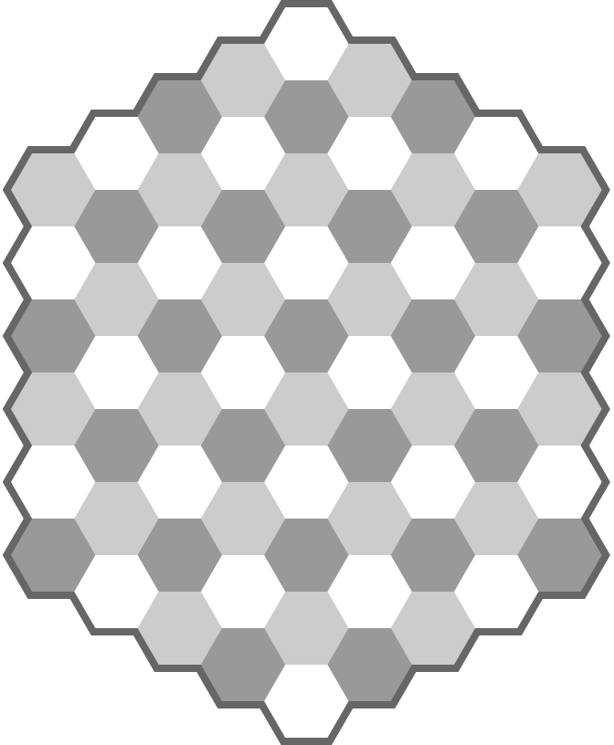 The boards consist of hexagonal fields. Usually everything is one and a half as many as on the rectangular board: each field has six sides instead of four, there are three field colours instead of two, and there are six natural directions instead of four. Pieces can usually move in one and a half times the directions than on the rectangular board.